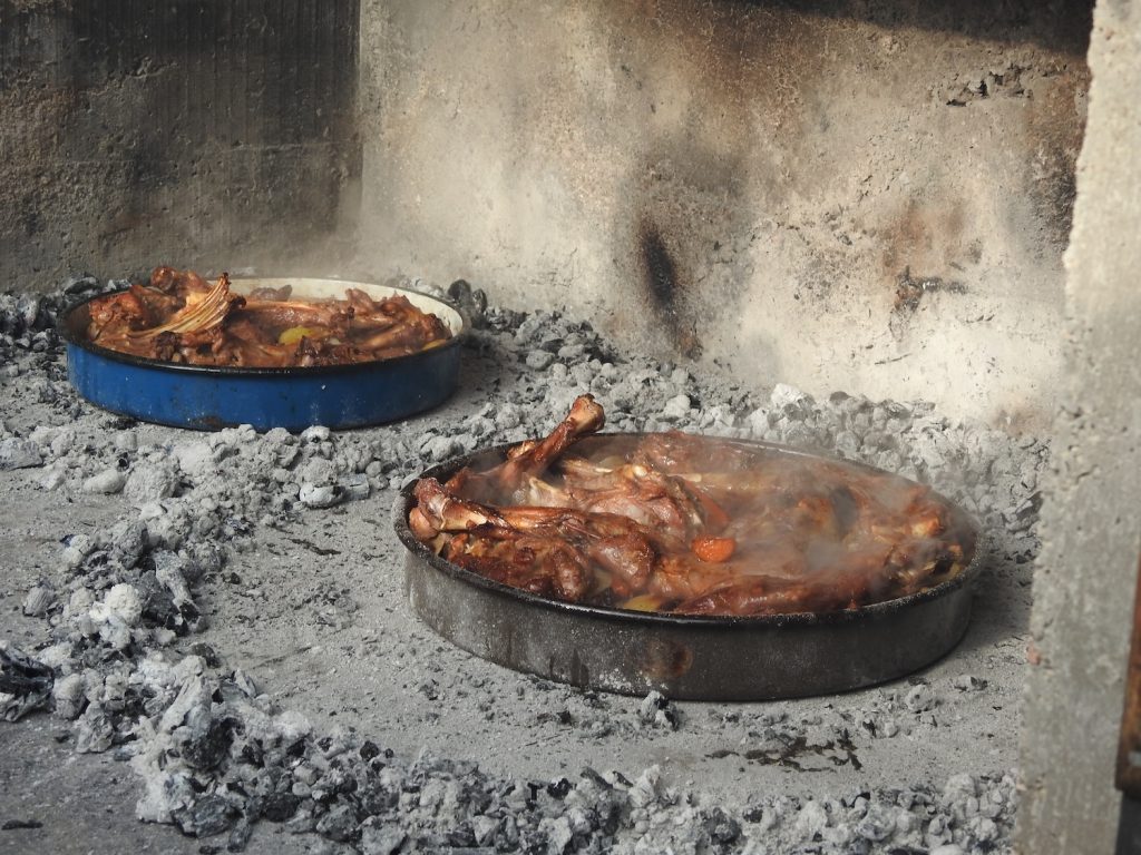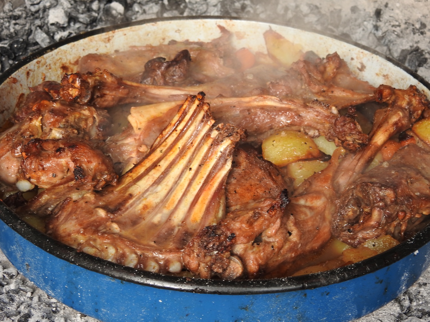 Boris je prvu kontrolu napravio za približno pola sata. U ovome trenutku veći dio tekućine koja se stvorila u posudi od mesa i krumpira odlio je u jednu posudu koju je ostavio na sigurnom mjestu. Okrenuo je meso i krumpire, odnosno zamijenio njihovo mjesto. Krumpiri sada dole, a meso gore. Opet je sve prekrio pekom pa žeravicom. Nakon još pola sata ponovna kontrola. Sad je trebalo dodati tekućine iz pospremljene posude. Boris preferira da se krumpiri i meso više peku, a manje kuhaju, ali ne smiju ostati na suhom. Miris je privukao društvo bliže vatri i svi su htjeli sudjelovati oko procijene kad bi trebalo opet obaviti kontrolu i treba li meso i krumpir dobiti još boje. U tom slučaju treba staviti malo više žara na peku. Boris je suvereno držao uzde, bolje rečeno peku, u svojim rukama. Približno za još pola sata kad je krumpir omekšao i meso se odvajalo od kostiju sve je bilo gotovo. Što je bilo bolje, krumpir ili kozlić? Teško je reći! Sve je brzo nestajalo. Usne ljepljive od toča ispirali smo vinom kojim smo nazdravljali slavljeniku i iskonskoj hrani.