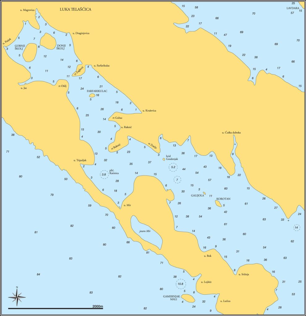 Duboka luka, nadohvat Kornatima, prema kojima je otvorena, uvučena je u kopno četiri i pol milje, a u najširem dijelu široka je skoro milju. U svome unutarnjem dijelu put zapada krije ravnih dvadeset i pet manjih i većih uvala. Tako će se dok uplovljavate u Telašćicu pred vama nizati prizori posve zaštićenih i zatvorenih uvala, nalik jezerima.
