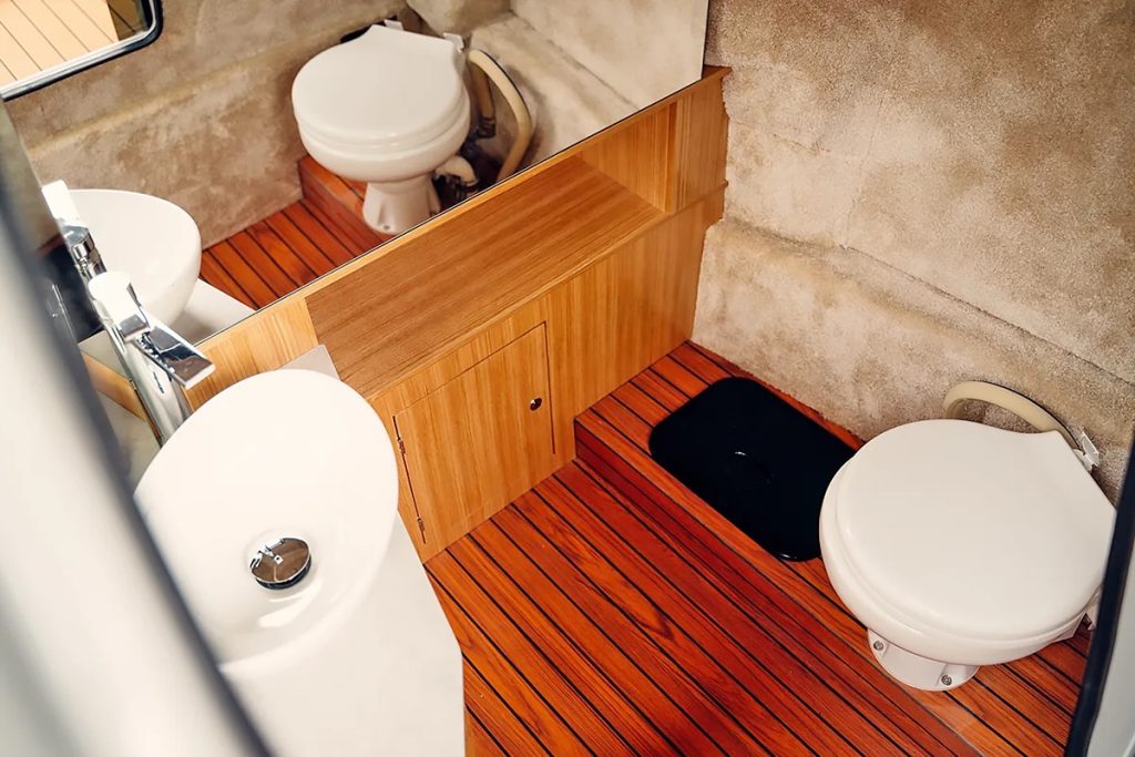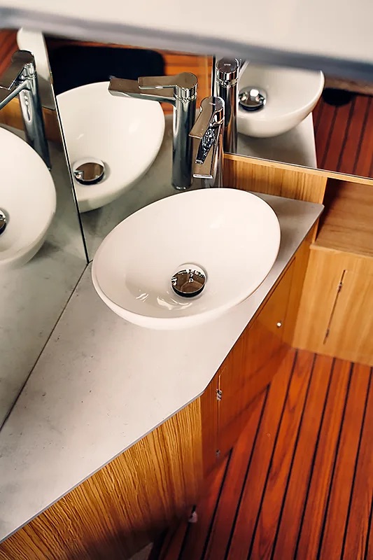 Oprema: centralna konzola s profesionalnim panelom, hidrauličko kormilarenje, bilge pumpa, električni vodeni sustav, hladnjak, spremišta za vodene rekvizite